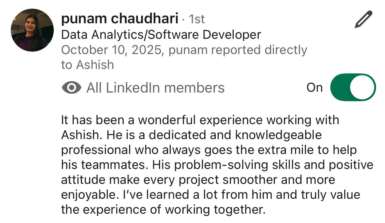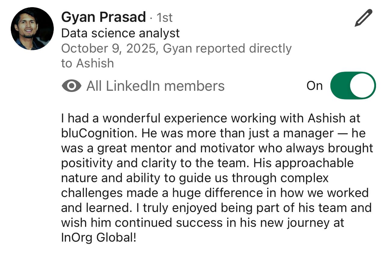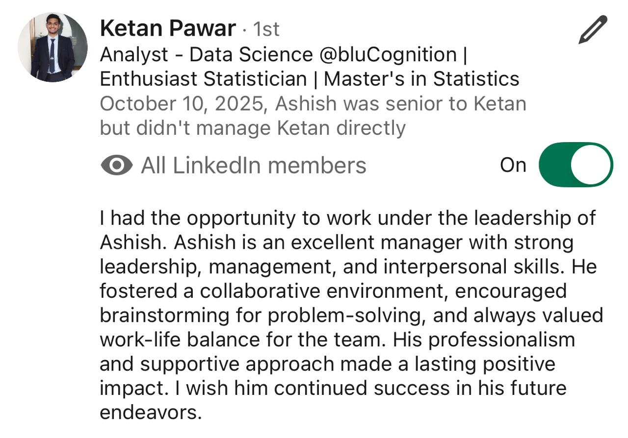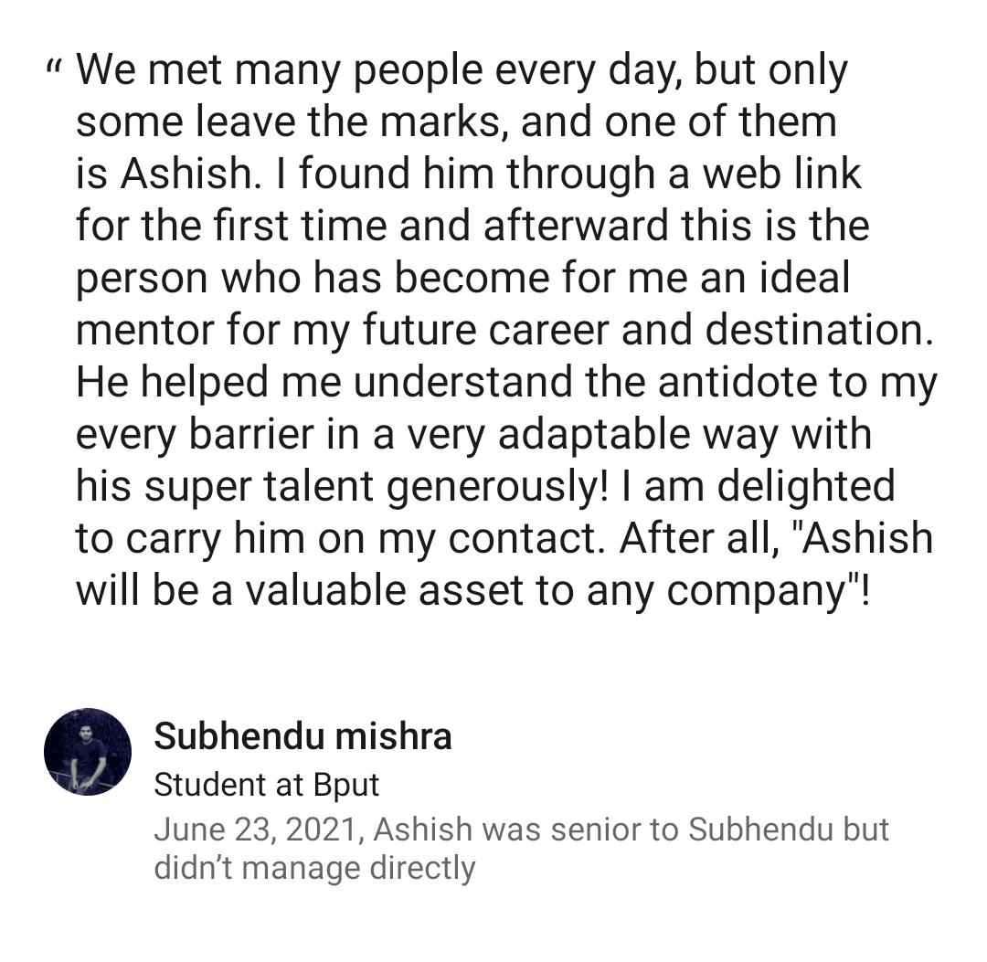Welcome to my feedbacks page! Here you'll find testimonials and reviews from colleagues, mentors, and peers. Check back for updates.