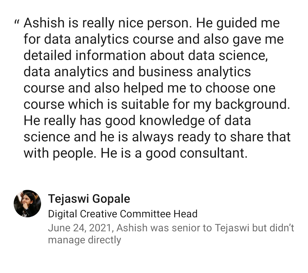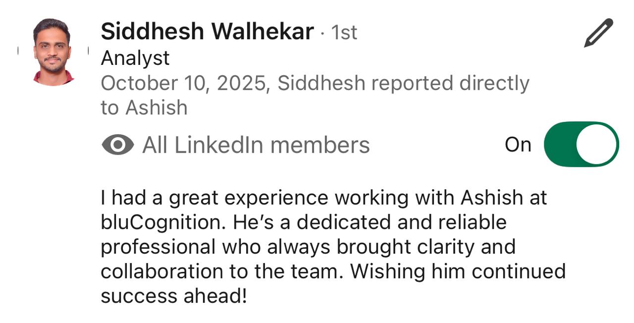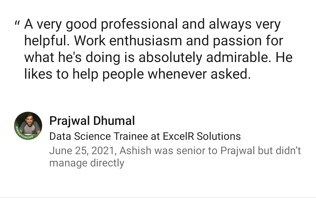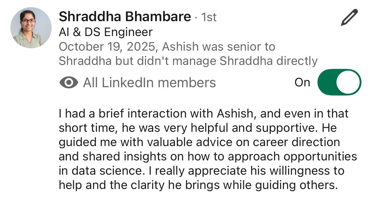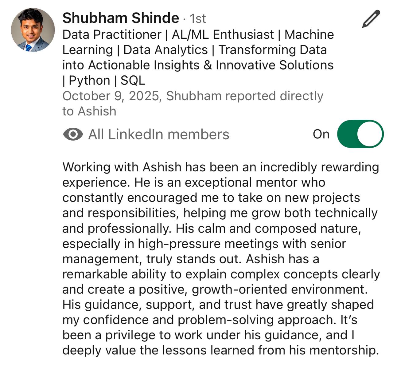 Welcome to my feedbacks page! Here you'll find testimonials and reviews from colleagues, mentors, and peers. Check back for updates.